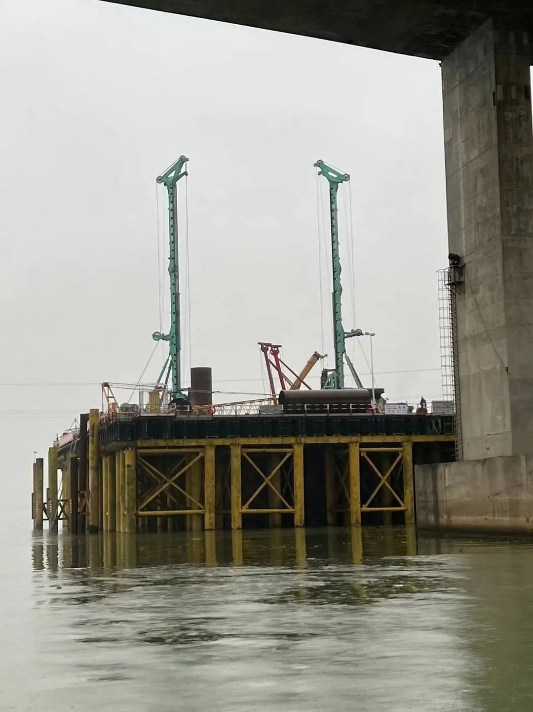據(jù)悉,佛山特大橋工程位于莞佛高速,富灣特大橋北側(cè)江面承臺上施工。承臺為地樁承臺,尺寸為19.15*30.7*4m,采用雙壁鋼圍堰施工,該承臺圍堰的同時也作承臺模板使用,高度41m。