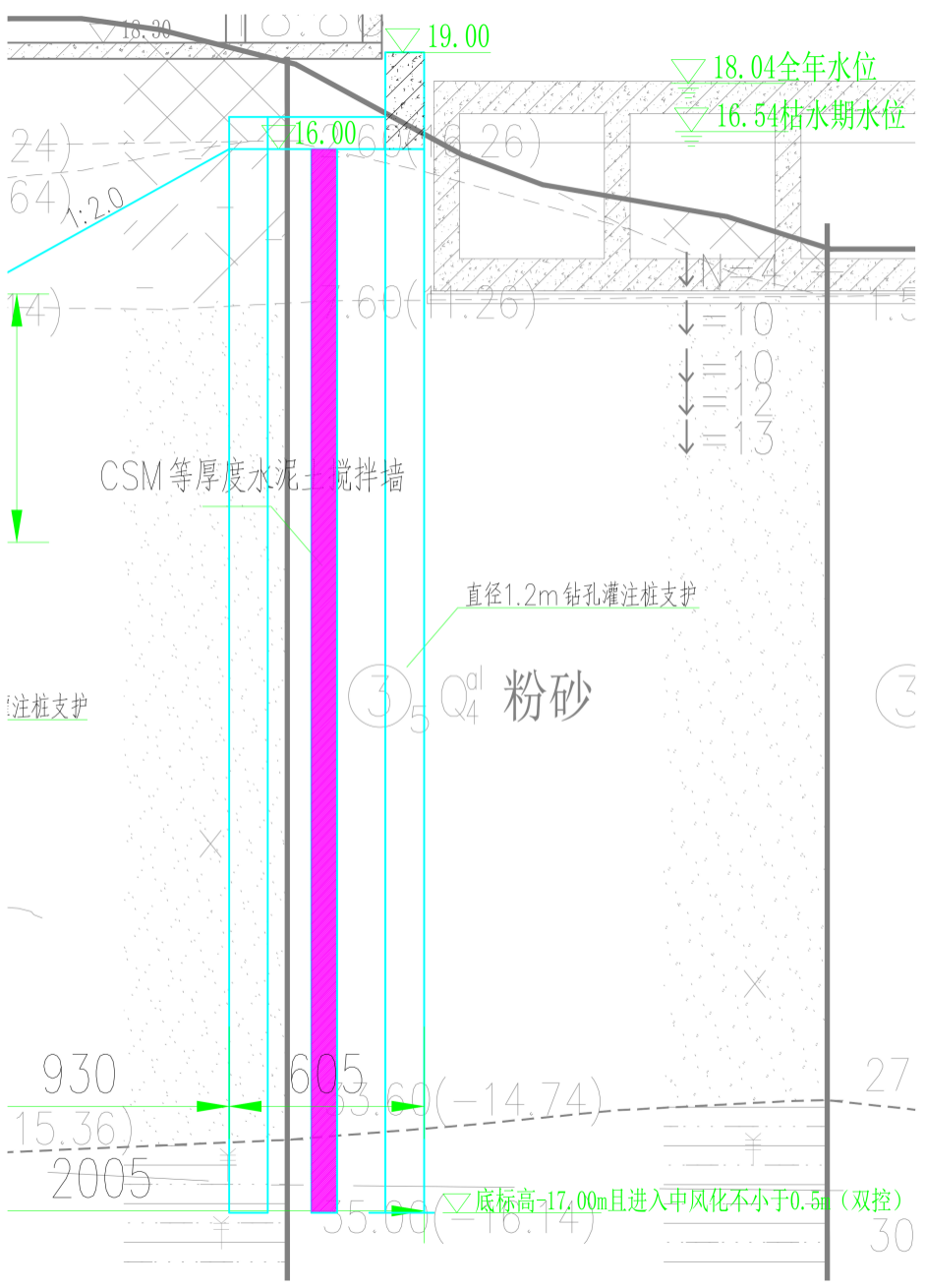 泵站基坑工程重要性等級(jí)為一級(jí),防滲墻采用SMC工法施工,墻厚800mm,墻體進(jìn)入中風(fēng)化巖層0.5m,有效墻長(zhǎng)33m,基坑普挖深度6.75m~16.20m,其中泵站區(qū)域開(kāi)挖達(dá)18.50m。