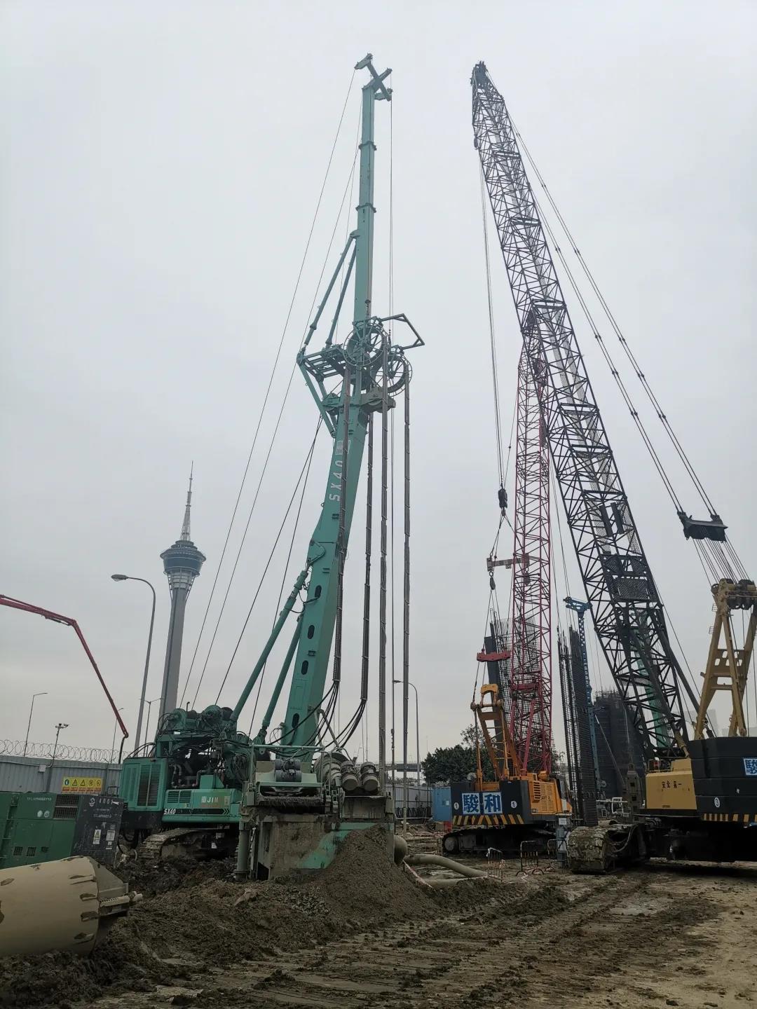 經現場施工管理人員介紹:“臨近西灣湖景大馬路堤圍加固工程算得上是鋼筋混凝土地連墻教科書級工程,工地上可直面看到地連墻施工主流“抓銑”與“抓鉆銑”的施工工藝,在金泰SX系列銑槽機、SG系列成槽機以及SH系列旋挖鉆機的加持下,工程進度穩步向前,不出意外將與兄弟單位施工的粵澳新通道青茂口岸澳方聯檢大樓工地一樣提前完成施工。