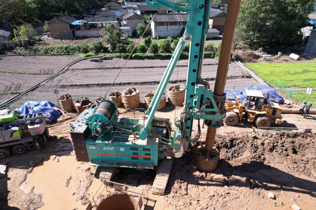 ? ? ? ?近日,金泰國四新產品SH58F多功能旋挖鉆首次亮相云南麗江市玉維高速公路段-黎明大橋樁基礎施工。該項目鉆孔直徑大,深度深、地層硬、含豐富沙層、易塌孔、工藝復雜、工期緊,施工具有一定難度。金泰國四新設備SH58F現已完成第六根深度為82m超深鉆孔灌注樁,施工速度快,成孔質量高,獲承建方高度認可。